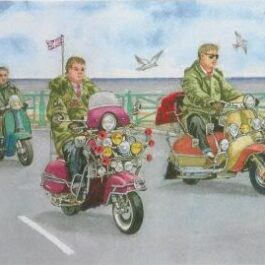 A delightful selection of motor scooter greetings card. Our watercolour, fine art cards depict nostalgic, vintage scenes of motor scooters.